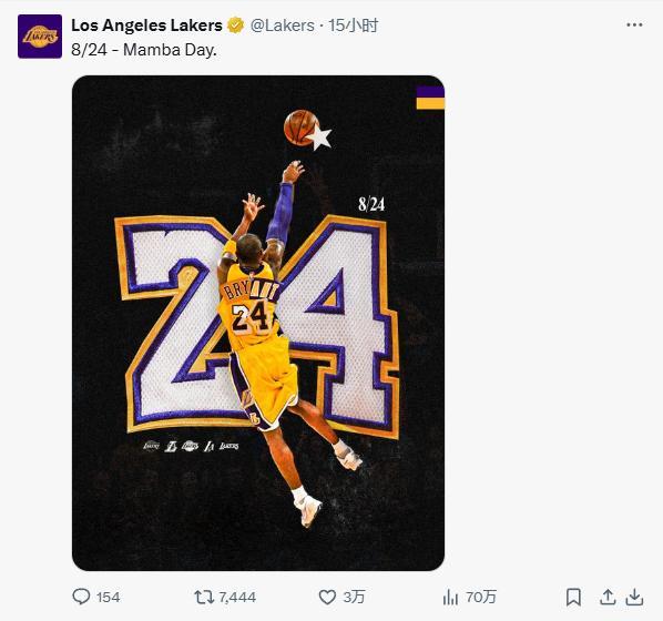 1、湖人官方:“洛杉矶之心,生日快乐,科比 ”
