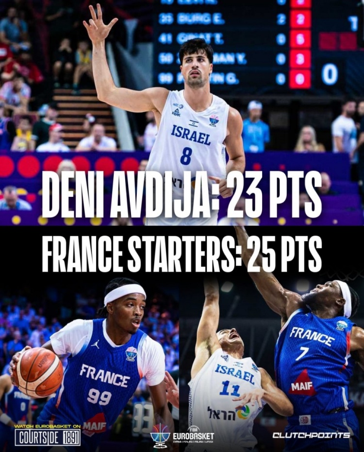 以色列前锋阿夫迪亚表现抢眼,全场10投7中砍下23分8篮板,另贡献2助攻2抢断;反观法国队首发五将总分仅25分,形成鲜明对比。