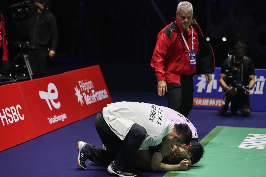 这张照片被一些网友戏称为“桃园三结义”,摄影师拍到了石宇奇在巴黎世锦赛男单决赛2比1力克昆拉武特之后难掩激动、跪在地上的场景。从比赛过程来看,第一局18比12领先被泰国名将逆转,第二局21比10速胜,决胜局“石头”更是3比8落后的情况下完成翻盘!石宇奇打出了一场硬仗,一场含金量十足的比赛,也帮助国羽男单时隔10年再度在世锦赛上问鼎。