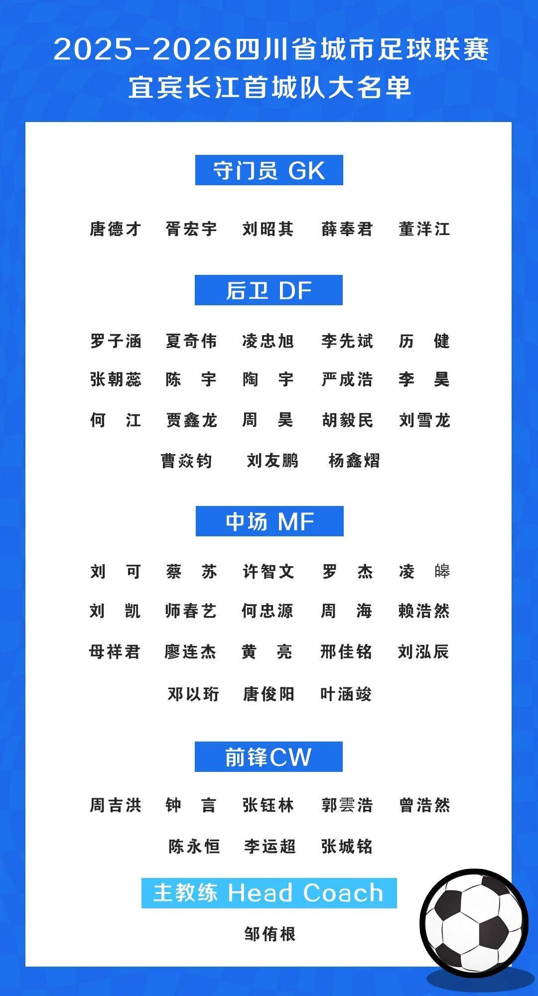 英雄联盟世界赛 视频-川超宜宾队公布大名单:邹侑根挂帅,定名宜宾长江首城队