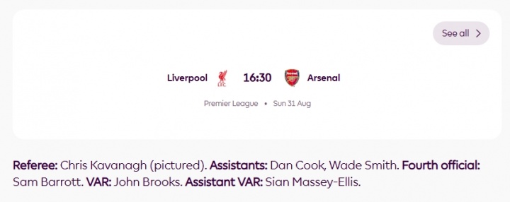 利物浦vs阿森纳最新裁判组: